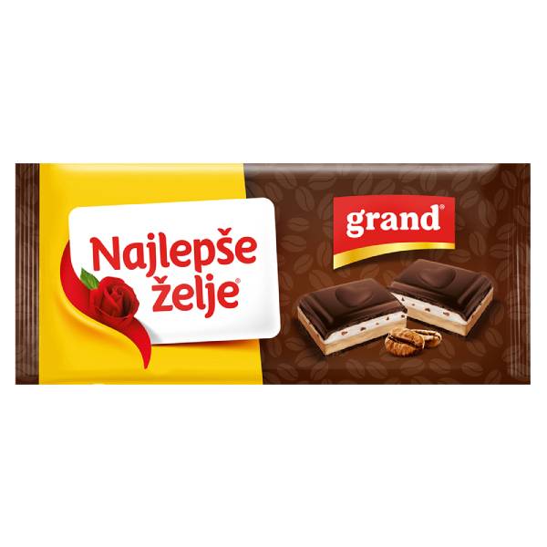 Najlepše želje Grand Kafa čokolada 184g – fina mlečna čokolada obogaćena aromom omiljene Grand kafe, koja spaja kremastu slatkoću sa bogatim ukusom kafe. Praktično pakovanje od 184g idealno je za uživanje kod kuće, na poslu ili kao sladak poklon, pružajući savršen spoj energije i užitka u svakoj prilici.