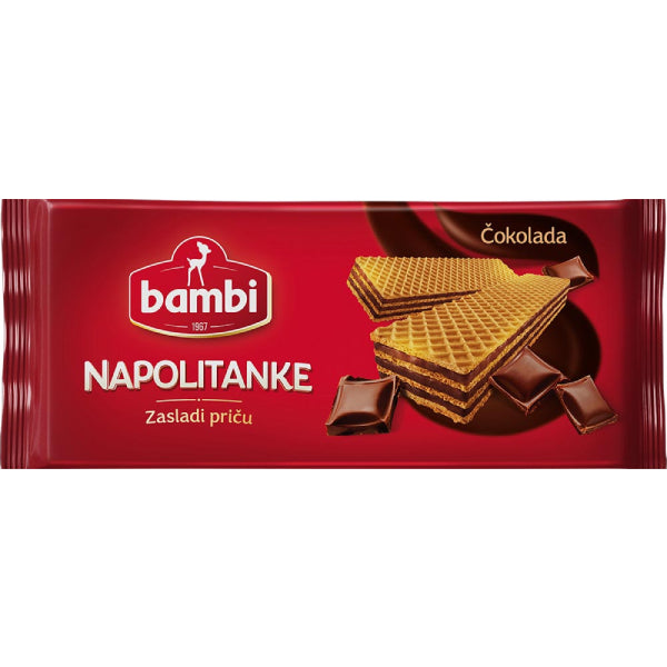 185g BAMBI NAPOLITANKE ČOKOLAD – Hrskave napolitanke ispunjene bogatim čokoladnim kremom koji donosi prepoznatljiv i neodoljiv ukus. Idealne su za slatki predah tokom dana, uz kafu, mleko ili čaj. Pakovanje od 185g pruža savršen balans praktičnosti i uživanja, bilo da ih konzumirate sami ili delite sa porodicom i prijateljima.