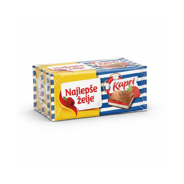 Najlepše želje Kapri čoko 190g (paket 23 komada) – fina mlečna čokolada inspirisana ukusom popularnog Kapri sladoleda, sa savršenim spojem čokolade, voćnih nota i lagane kremaste teksture. Praktično pakovanje od 23 komada obezbeđuje dovoljno poslastica za deljenje sa porodicom, posluženje gostima ili uživanje u posebnim trenucima, donoseći osvežavajući i jedinstven čokoladni užitak u svakoj prilici.