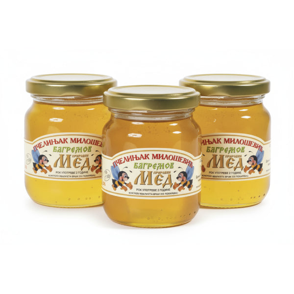 Ovaj paket donosi tri tegle čistog bagremovog meda Milošević, poznatog po blagom ukusu, svetloj boji i vrhunskom kvalitetu.