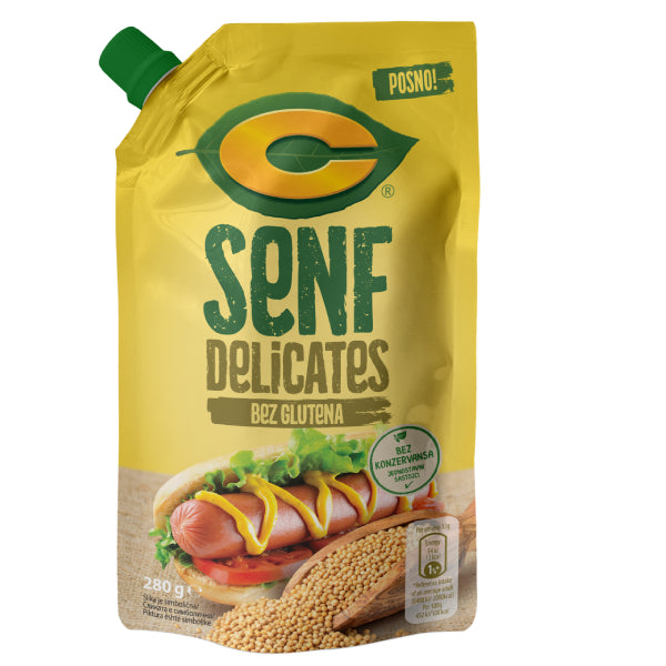 Blagi i aromatični senf u praktičnom pakovanju. “C” Senf dojpak od 280 g napravljen je od fino mlevenih zrna gorušice i pažljivo odabranih začina koji mu daju prijatan, uravnotežen ukus. Idealan je kao dodatak uz meso, kobasice, sendviče, pomfrit ili jela sa roštilja. Zahvaljujući praktičnom dojpak pakovanju, lako se dozira i čuva svežina proizvoda.